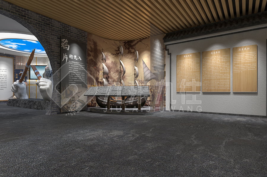 一廳的建筑造型為一個(gè)長(zhǎng)方形的走廊,兩側(cè)墻壁上分別展示了毒品的起源和中國(guó)禁毒的歷史。毒品的起源部分采用了圖文并茂的方式,介紹了最初的“毒品”是如何出現(xiàn)的,以及毒品是如何隨著歷史的發(fā)展而演變的,讓參觀(guān)者了解毒品的歷史淵源和危害性。中國(guó)禁毒的歷史部分采用了時(shí)間軸的方式,展示了從張騫出使西域到新中國(guó)成立后的禁毒工作的重大事件和成果,突出了中國(guó)人民在禁毒斗爭(zhēng)中的艱辛和不屈,以及中國(guó)政府在禁毒事業(yè)中的堅(jiān)定立場(chǎng)和主張。兩側(cè)墻壁上還設(shè)有多個(gè)觸摸屏,可以播放相關(guān)的視頻和圖片,增加參觀(guān)者的互動(dòng)性和趣味性。一廳的中央是一個(gè)圓形的互動(dòng)滑軌屏,名為《中華之殤——禁毒歷史互動(dòng)游戲》,可以讓參觀(guān)者通過(guò)滑動(dòng)屏幕上的時(shí)間軸,選擇不同的歷史時(shí)期,觀(guān)看相關(guān)的禁毒故事和案例,測(cè)試自己的禁毒知識(shí),提高自己的禁毒意識(shí)。